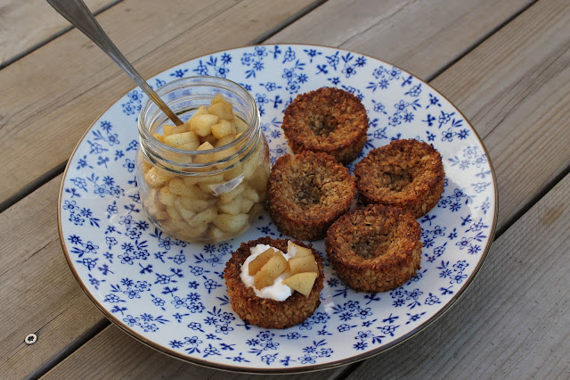 Havre- och hasselnötsformarna är enkla att göra och de går att fylla med valfri fyllning. Jag har valt att fylla dem med äppelkompott och turkisk yoghurt, vilket inte blev för sött och går då även att äta till frukost. Förslag på andra fyllningar är glass eller vispad grädde och bär.